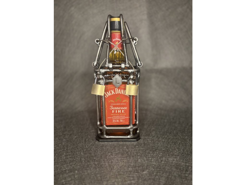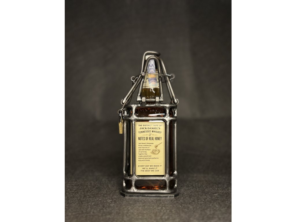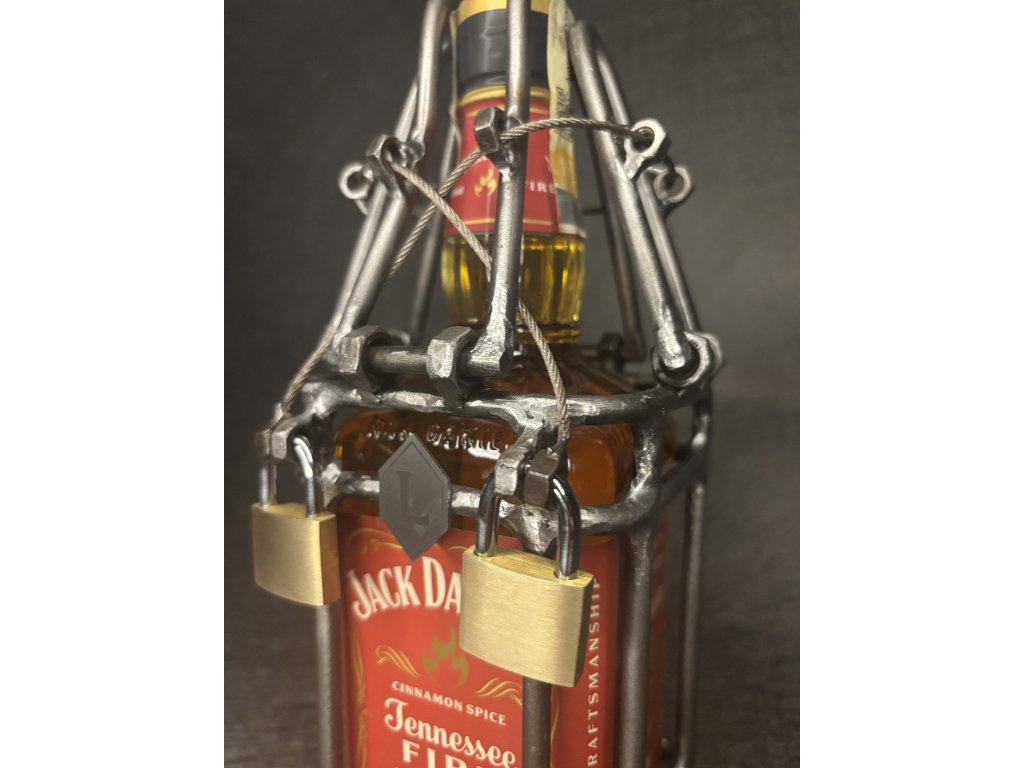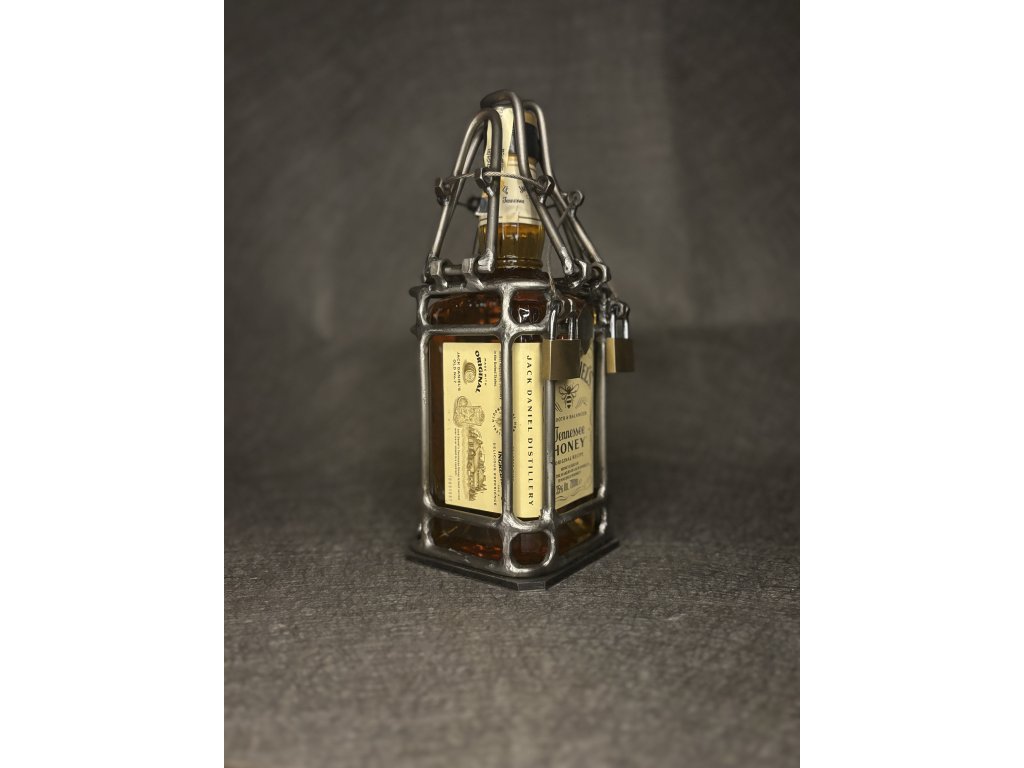 Prémiová láhev Jack Daniel’s je umístěna v robustní, ručně svařované kovové kleci s lankovými zámky. Tento jedinečný design spojuje estetiku s funkčností – láhev je chráněna a přístup k ní je možný pouze po odemknutí. Klec je navržena pro opakované použití, takže ji lze po vyprázdnění láhve znovu osadit stejným nebo podobným typem lahve.
